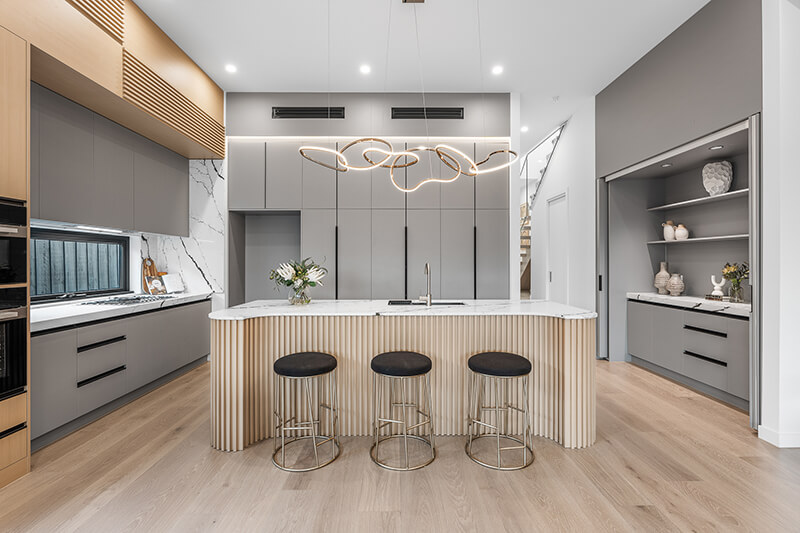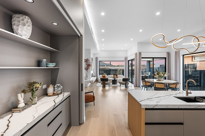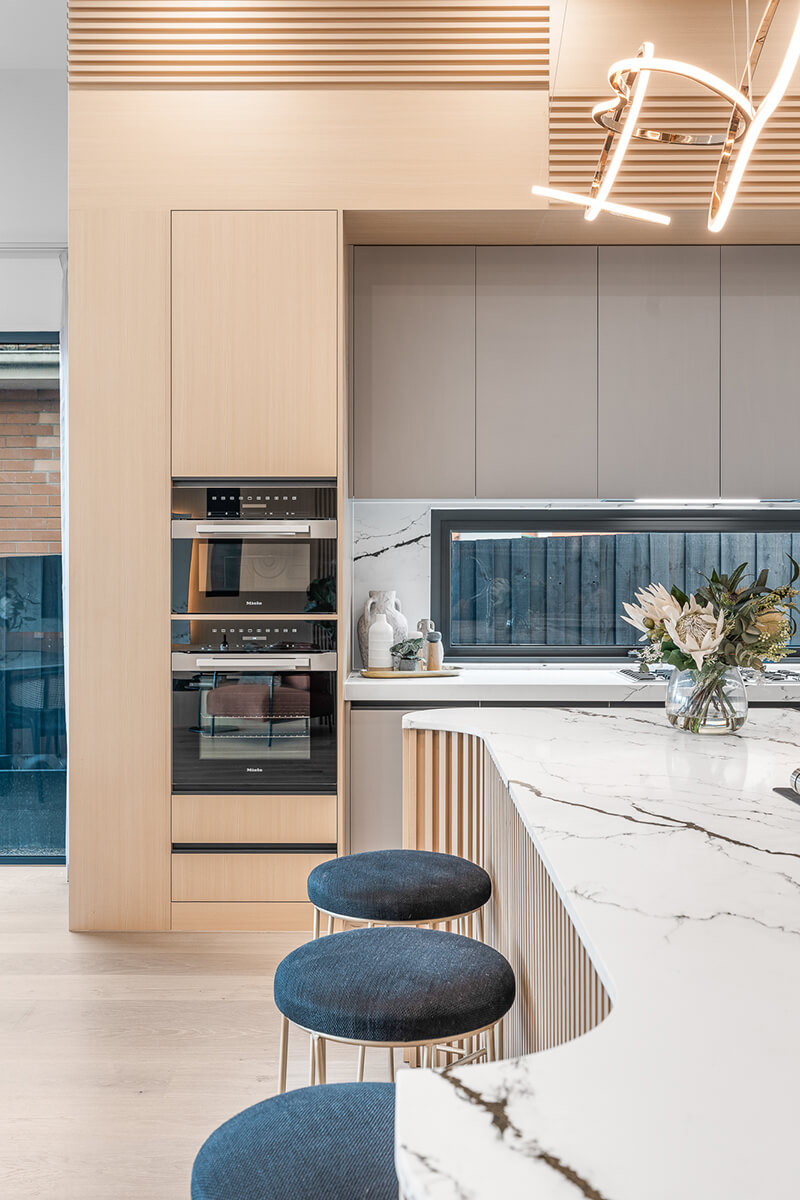 State-of-the-art quality is reflected in the kitchen boasting stone benches, designer details, Miele appliances (oven, microwave, gas stove and integrated dishwasher) plus an adjacent hidden bar area. Picture windows and sliding doors allow for an effortless indoor-outdoor ambience, opening onto an alfresco entertaining space and low-maintenance, landscaped yard.