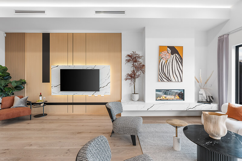 Eye catching upon arrival, the home’s style starts from the outside and continues as you enter and wander down the hallway into the lavish living, dining and kitchen domain that’s adorned with premium floorboards and a Rinnai fireplace.